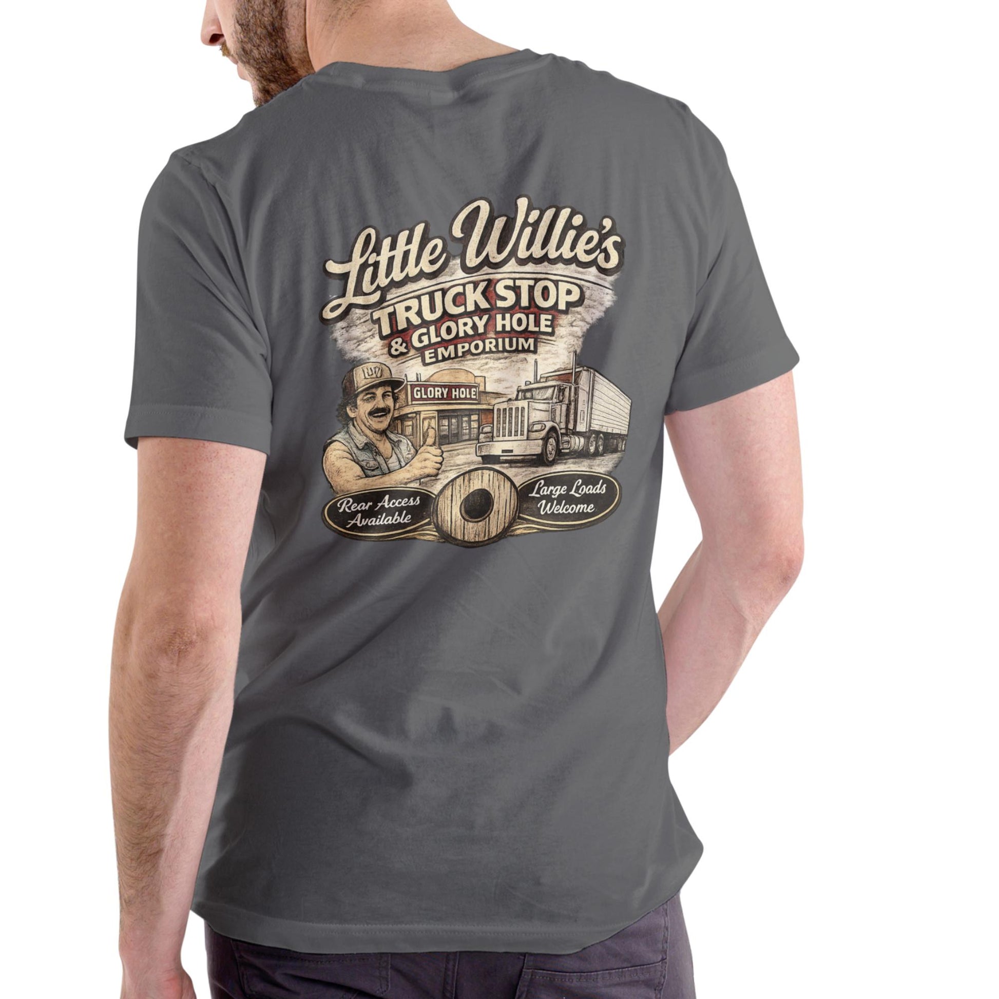 LITTLE WILLIES TRUCK STOP AND GLORY HOLE EMPORIUM Funny T Shirt, Unisex Cotton